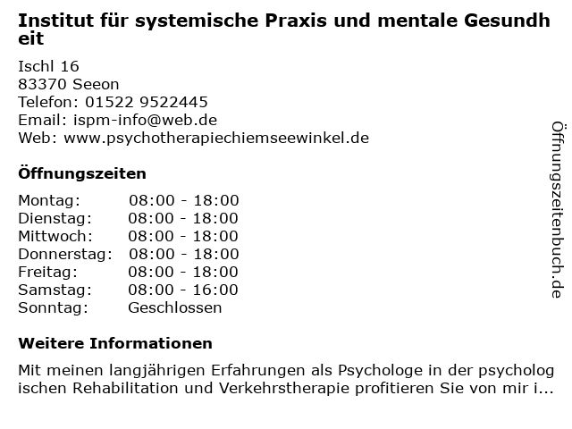 1 Institut für systemische Praxis und mentale Gesundheit ISPM (Entfernung: 0,01 km) Ischl 16, 83370 Seeon-Seebruck 2 Institut für systemische Praxis und mentale Gesundheit - MPU-Süd (Entfernung: 0,11 km) Ischl 6, 83370 Seeon-Seebruck 3 Gesundheit für Mensch und Tier VITARING- Biomedsystems GmbH (Entfernung: 7,85 km) Wirtsfeld 43, 83361 Kienberg 4 Vital- & Bewusstseinszentrum Gesundheit-Wellnes-Schönheit-Körperpflege (Entfernung: 8,48 km) Herzog-Ludwig-Str. 1, 83308 Trostberg 6 |