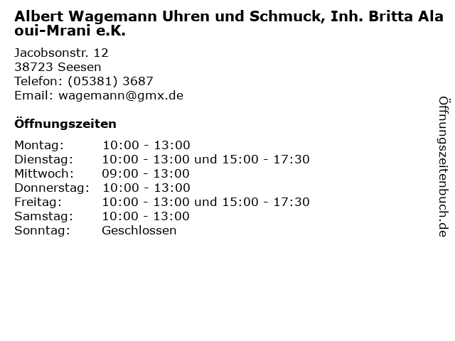Branchen & Suchbegriffe zu Albert Wagemann Uhren und Schmuck, Inh. Britta Alaoui-Mrani e.K.:alaoui, alaoui-mrani, albert, britta, e.k., mrani, schmuck, uhren, wagemann |