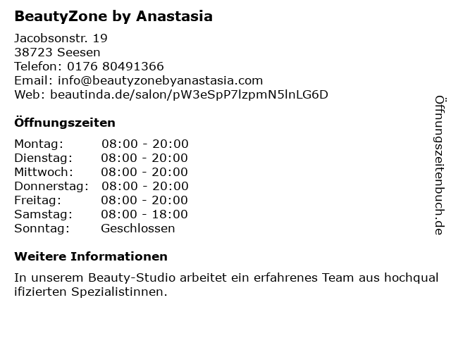 | Öffnungszeiten BeautyZone by Anastasia in Seesen anzeigen | |