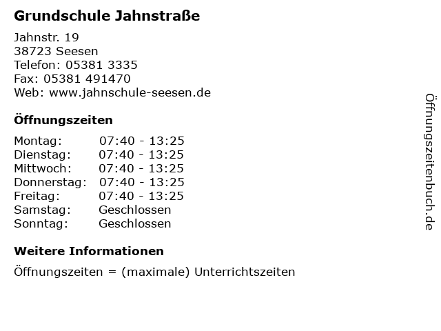 | Öffnungszeiten Grundschule Jahnstraße in Seesen anzeigen | |