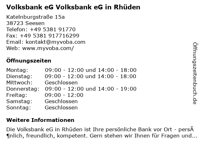1 Volksbank eG Alfeld·Bad Gandersheim·Bockenem·Einbeck·Langelsheim·Seesen - Beratungs-Geschäftsstelle Rhüden (Entfernung: 0,00 km) Katelnburgstraße 15a, 38723 Seesen 6 |