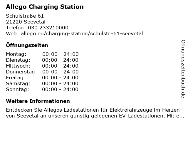 | Öffnungszeiten Allego Charging Station in Seevetal anzeigen | |