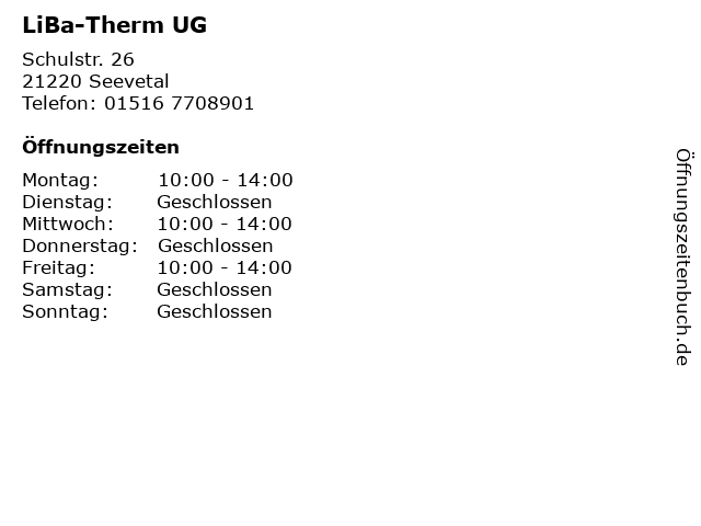 | Öffnungszeiten LiBa-Therm UG in Seevetal anzeigen | |