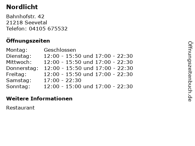 | Öffnungszeiten Nordlicht in Seevetal anzeigen | |