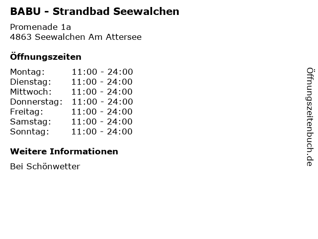 | Öffnungszeiten BABU - Strandbad Seewalchen in Seewalchen Am Attersee anzeigen | |