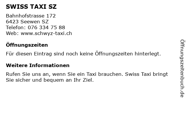 | Öffnungszeiten SWISS TAXI SZ in Seewen SZ anzeigen | |