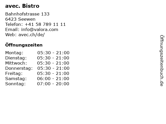 | Öffnungszeiten avec. Bistro in Seewen anzeigen | |