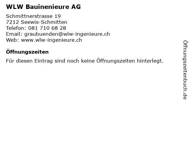 | Öffnungszeiten WLW Bauinenieure AG in Seewis-Schmitten anzeigen | |