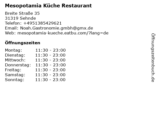 | Öffnungszeiten Mesopotamia Küche Restaurant in Sehnde anzeigen | |