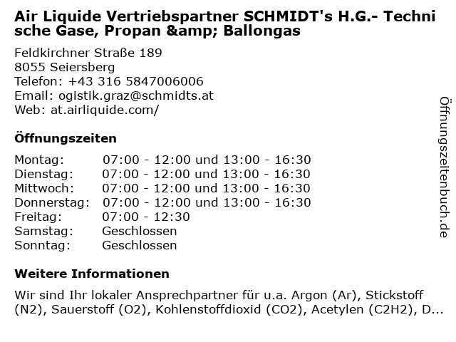 3 Air Liquide Vertriebspartner SCHMIDT'S HandelsgesmbH Graz - Technische Gase, Schweißgeräte & -zubehör & ALbee (Entfernung: 2,75 km) Feldkirchner Straße 189, 8055 Seiersberg 4 Odelga Ärztlich-technische Service- u. Vertriebs-GmbH (Entfernung: 2,79 km) Feldkirchner Straße 105, 8055 Graz 6 |