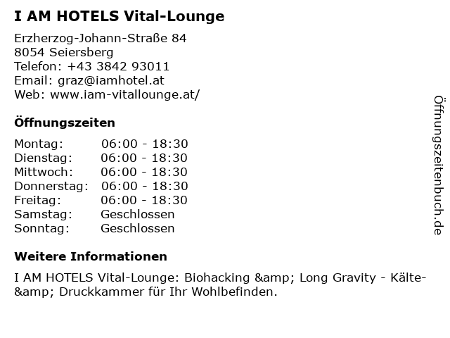 | Öffnungszeiten I AM HOTELS Vital-Lounge in Seiersberg anzeigen | |