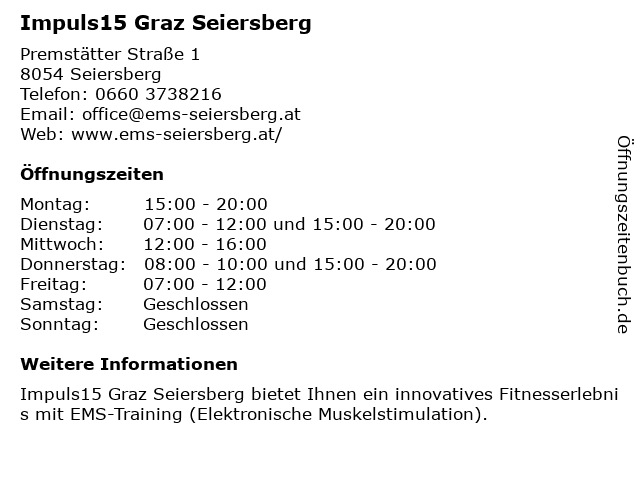 | Öffnungszeiten Impuls15 Graz Seiersberg in Seiersberg anzeigen | |