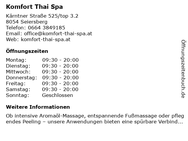 | Öffnungszeiten Komfort Thai Spa in Seiersberg anzeigen | |