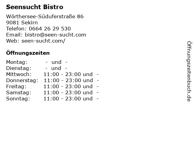 | Öffnungszeiten Seensucht Bistro in Sekirn anzeigen | |