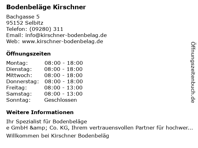 | Öffnungszeiten Bodenbeläge Kirschner in Selbitz anzeigen | |