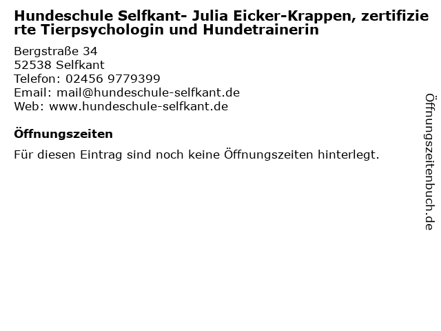 | Hundeschule Selfkant- Julia Eicker-Krappen, zertifizierte Tierpsychologin und Hundetrainerin anrufen | |