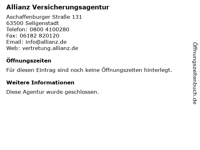 Öffnungszeiten Allianz Versicherungsagentur in Seligenstadt anzeigen