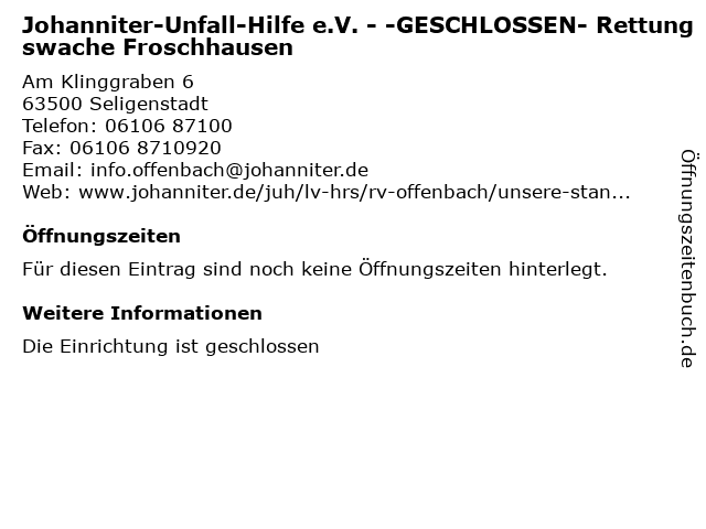 | Johanniter-Unfall-Hilfe e.V. - -GESCHLOSSEN- Rettungswache Froschhausen anrufen | |