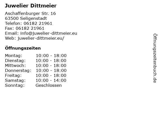| Öffnungszeiten Juwelier Dittmeier in Seligenstadt anzeigen | |
