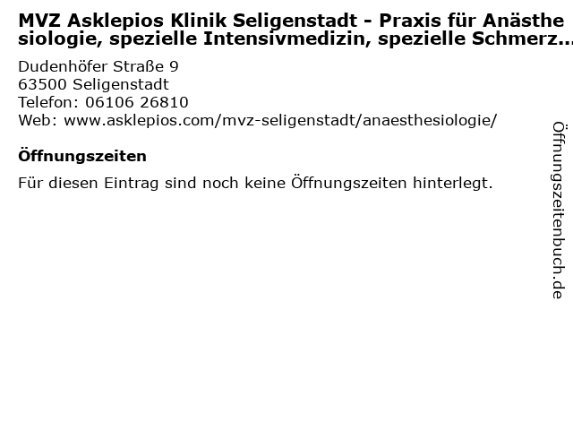 | Branchen & Suchbegriffe zu MVZ Asklepios Klinik Seligenstadt - Praxis für Anästhesiologie, spezielle Intensivmedizin, spezielle Schmerztherapie & Notfallmedizin (Standort Rodgau) - Closed:anästhesiologie, asklepios, closed, intensivmedizin, klinik, mvz, notfallmedizin, praxis, schmerztherapie, spezielle, standort |
