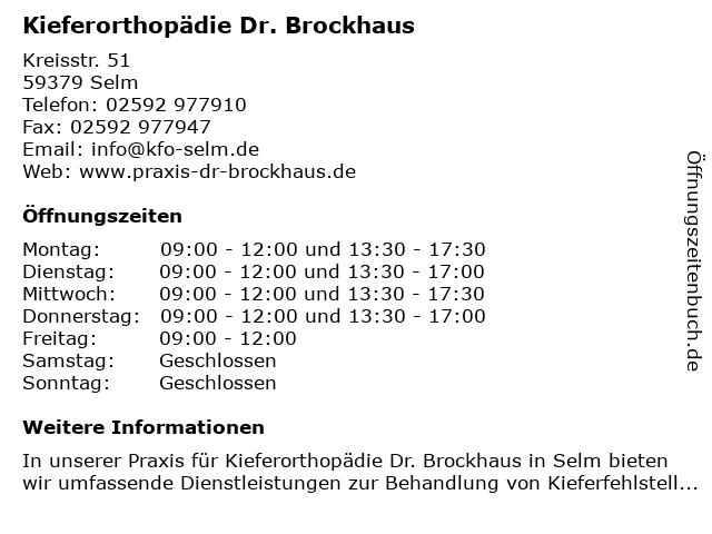 | Öffnungszeiten Kieferorthopädie Dr. Brockhaus in Selm anzeigen | |