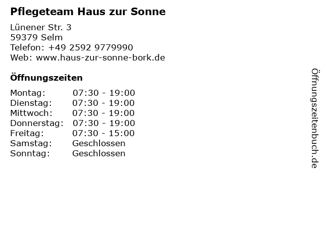 | Öffnungszeiten Pflegeteam Haus zur Sonne in Selm anzeigen | |