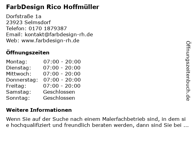 | Öffnungszeiten FarbDesign Rico Hoffmüller in Selmsdorf anzeigen | |