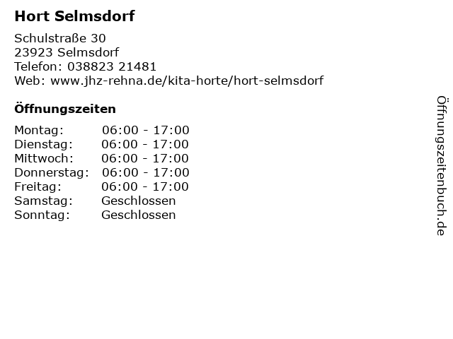 | Öffnungszeiten Hort Selmsdorf in Selmsdorf anzeigen | |