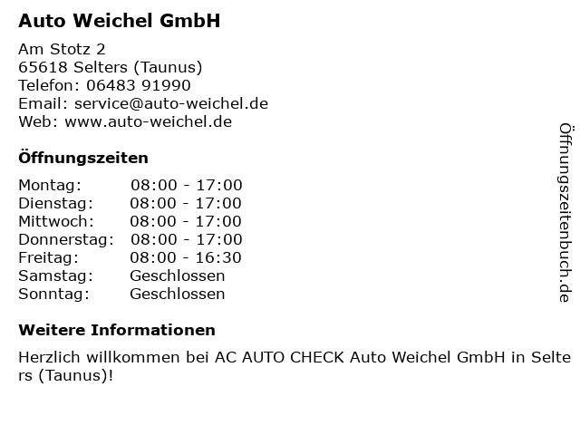 | Öffnungszeiten Auto Weichel GmbH in Selters (Taunus) anzeigen | |