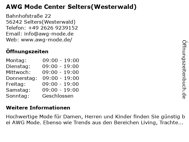 Branchen & Suchbegriffe zu AWG Mode Center Selters(Westerwald):arbeitskleidung, awg, bademode, bekleidung, bluse, center, damenmode, decke, herrenmode, hose, jacke, kindermode, kleid, mantel, mode, pullover, rock, selters, shirt, sportmode, textil, tracht, westerwald, wäsche |