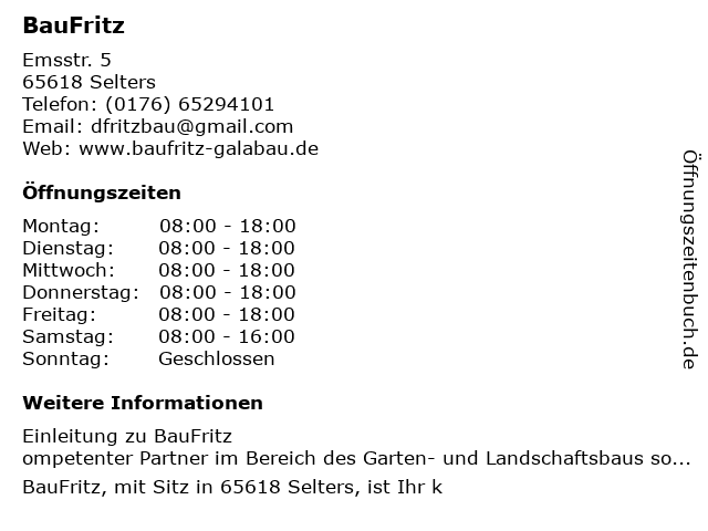 | Öffnungszeiten BauFritz in Selters anzeigen | |