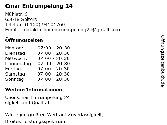 | Öffnungszeiten Cinar Entrümpelung 24 in Selters anzeigen | |