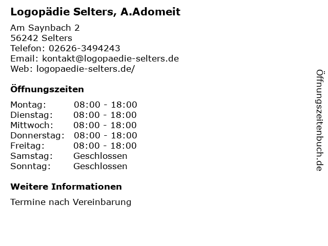 | Öffnungszeiten Logopädie Selters, A.Adomeit in Selters anzeigen | |
