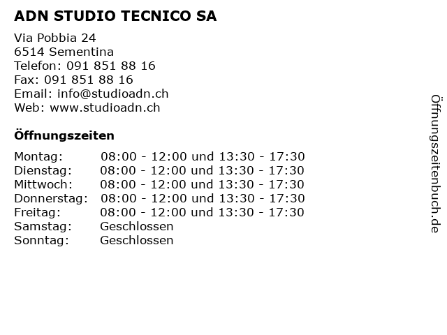 | Öffnungszeiten ADN STUDIO TECNICO SA in Sementina anzeigen | |