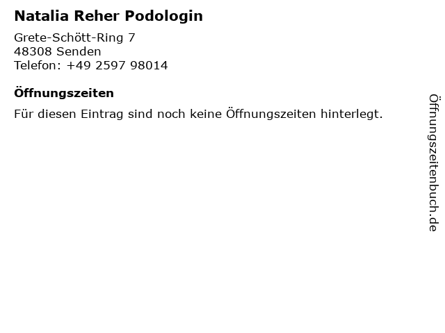 | Telefonnummer Natalia Reher Podologin in Senden (+49 2597 98014) anrufen | |