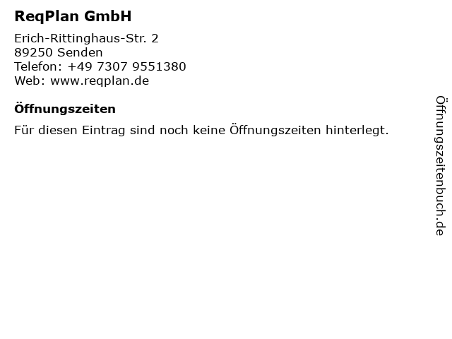 | Öffnungszeiten ReqPlan GmbH in Senden anzeigen | |