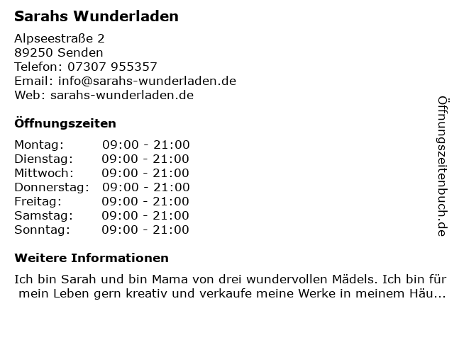 | Öffnungszeiten Sarahs Wunderladen in Senden anzeigen | |