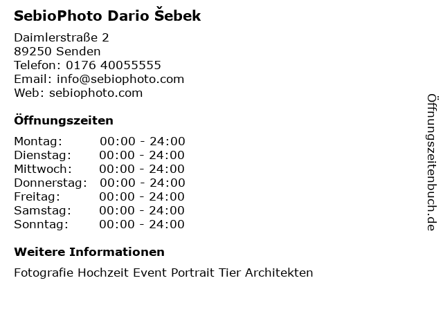 | Öffnungszeiten SebioPhoto Dario Šebek in Senden anzeigen | |