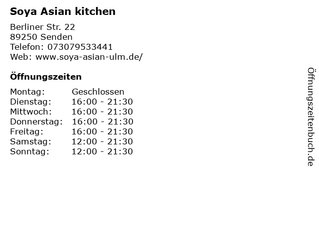 | Öffnungszeiten Soya Asian kitchen in Senden anzeigen | |