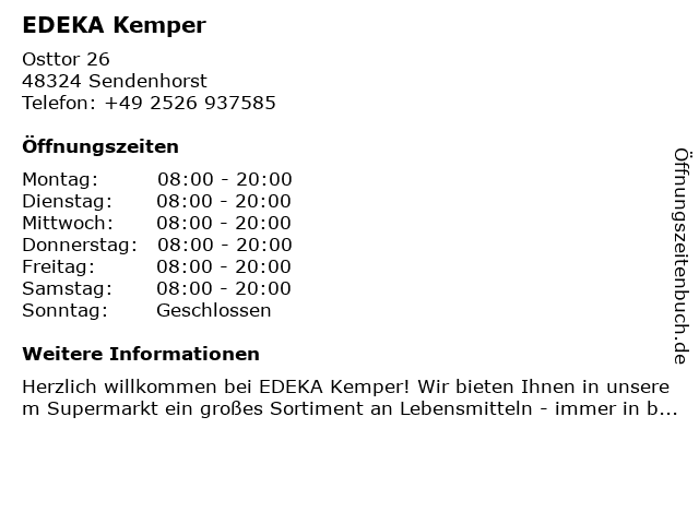 | Öffnungszeiten EDEKA Kemper in Sendenhorst anzeigen | |