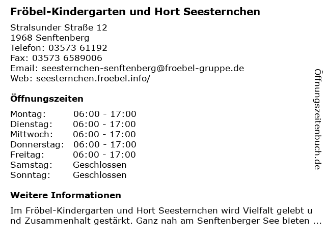 3 Fröbel-Kindergarten und Hort Zwergenhaus am See (Entfernung: 1,13 km) Straße Der Energie 22, 01968 Senftenberg 4 Fröbel-Erziehungs- und Familienberatung (EFB) Senftenberg (Entfernung: 1,43 km) Hörlitzer Straße 34, 01968 Senftenberg 6 Fröbel-Geschäftsstelle Senftenberg (Fröbel Bildung und Erziehung gGmbH, Region Lausitz) (Entfernung: 2,22 km) Puschkinstr. 7, 01968 Senftenberg |