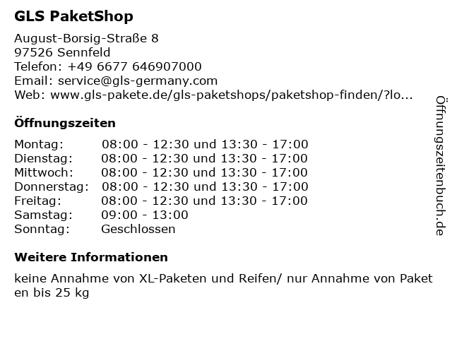 | Öffnungszeiten GLS PaketShop in Sennfeld anzeigen | |