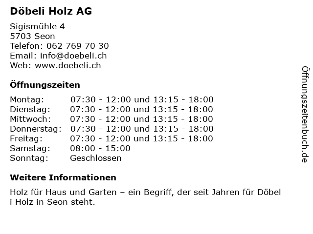 | Öffnungszeiten Döbeli Holz AG in Seon anzeigen | |
