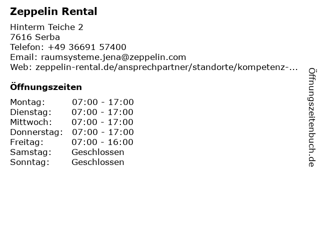| Öffnungszeiten Zeppelin Rental in Serba anzeigen | |