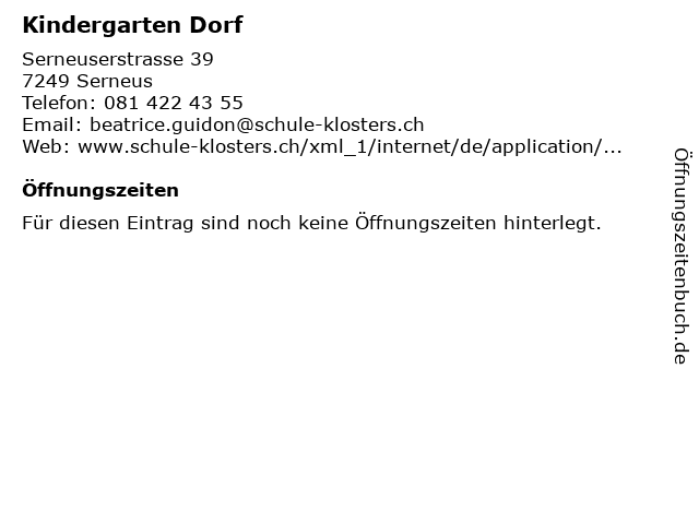 | Öffnungszeiten Kindergarten Dorf in Serneus anzeigen | |