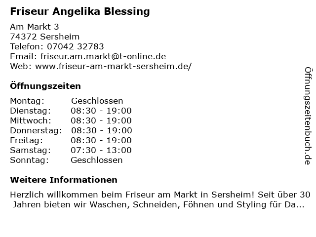 | Öffnungszeiten Friseur Angelika Blessing in Sersheim anzeigen | |