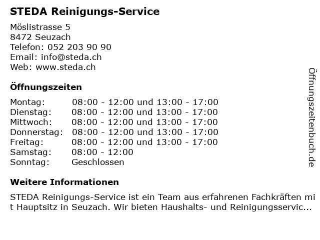 | Öffnungszeiten STEDA Reinigungs-Service in Seuzach anzeigen | |