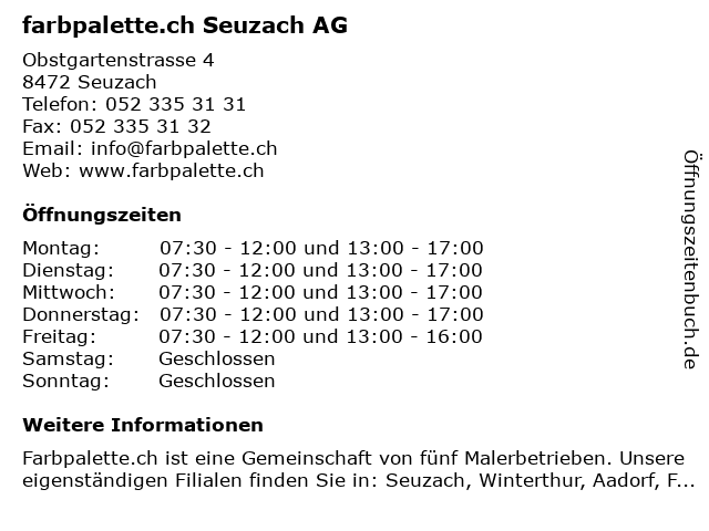 | Öffnungszeiten farbpalette.ch Seuzach AG in Seuzach anzeigen | |