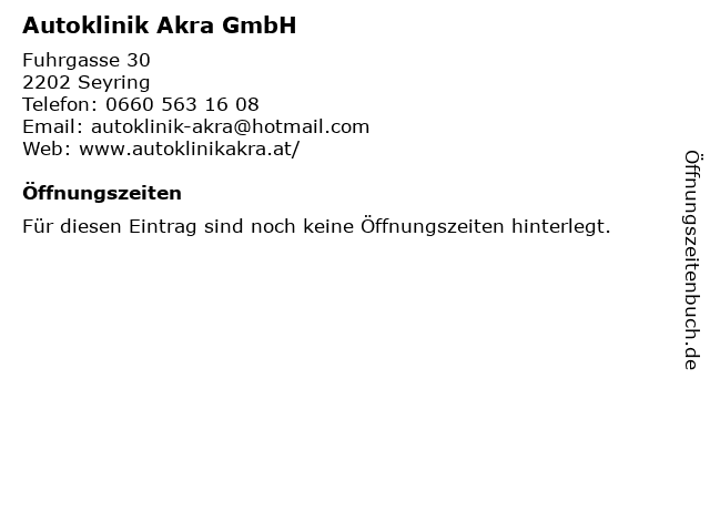 | Öffnungszeiten Autoklinik Akra GmbH in Seyring anzeigen | |