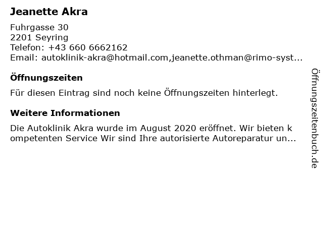 | Öffnungszeiten Jeanette Akra in Seyring anzeigen | |